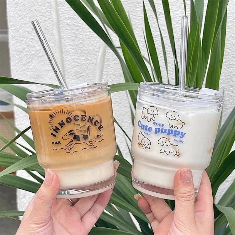 ワンちゃんのイラストが可愛いフタもストロー付きのグラスです‧✧̣̥̇‧