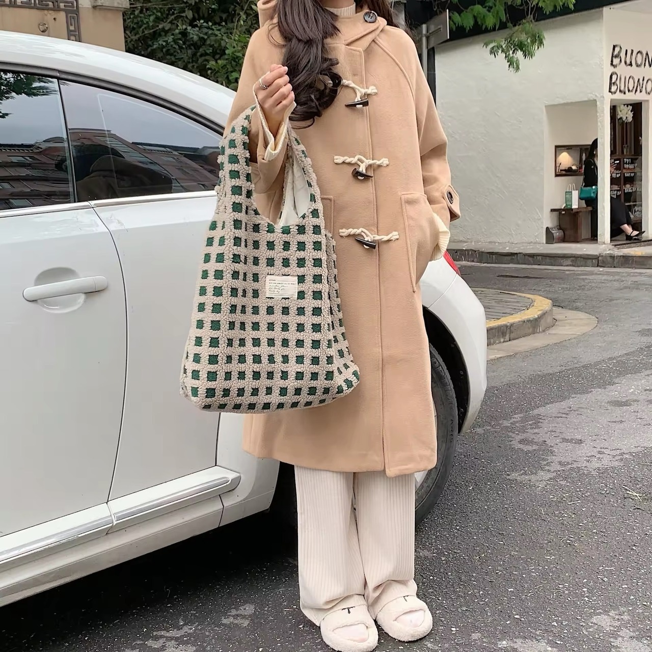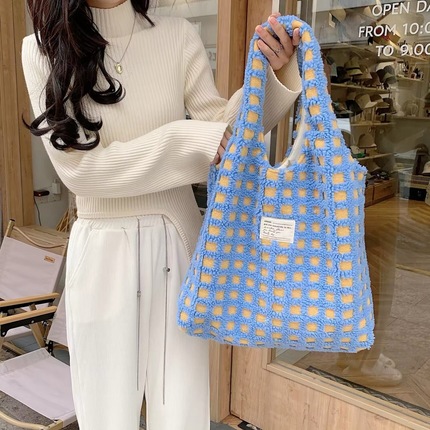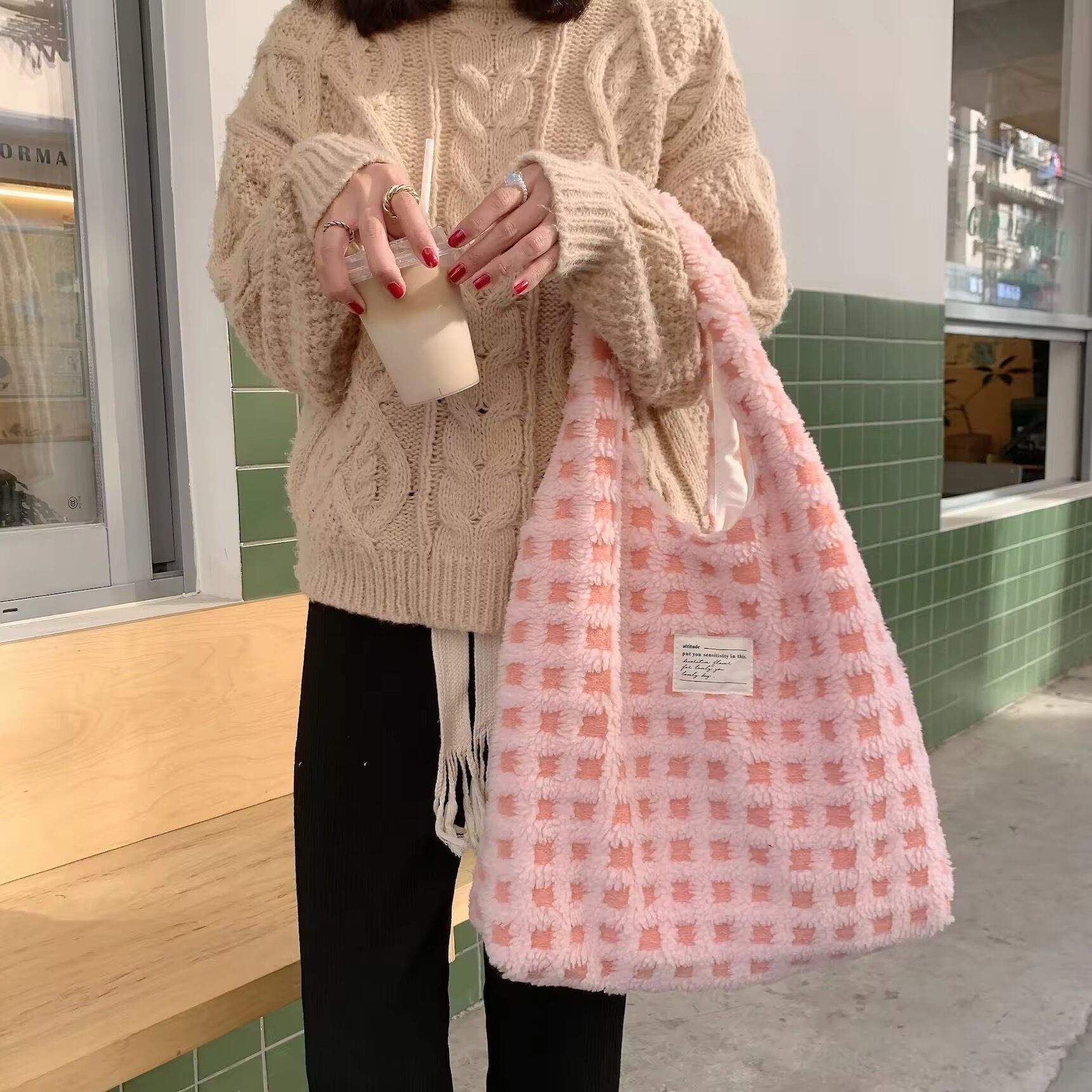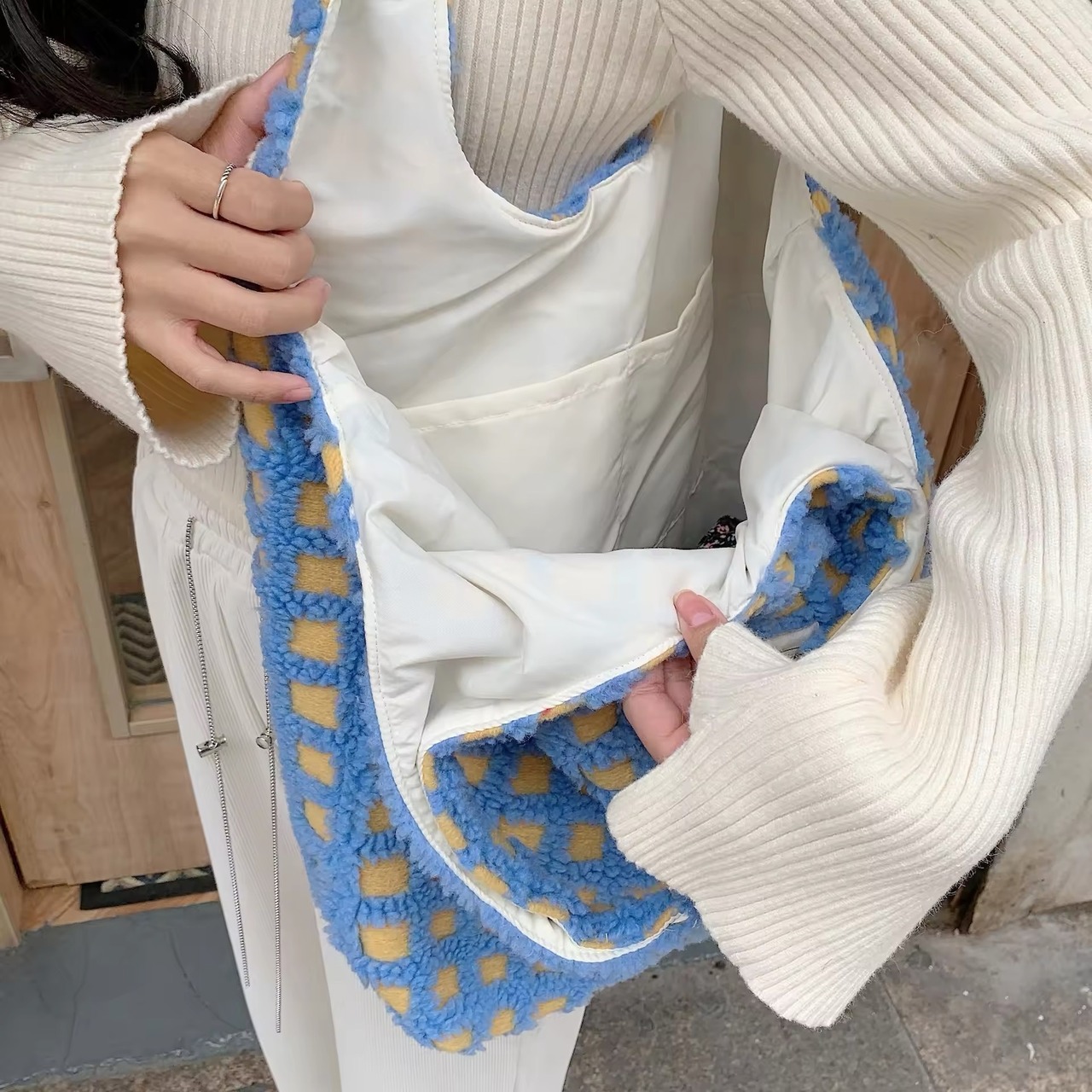 モコモコなボアの素材とチェックの組み合わせがとてもキュートなトートバッグ♡